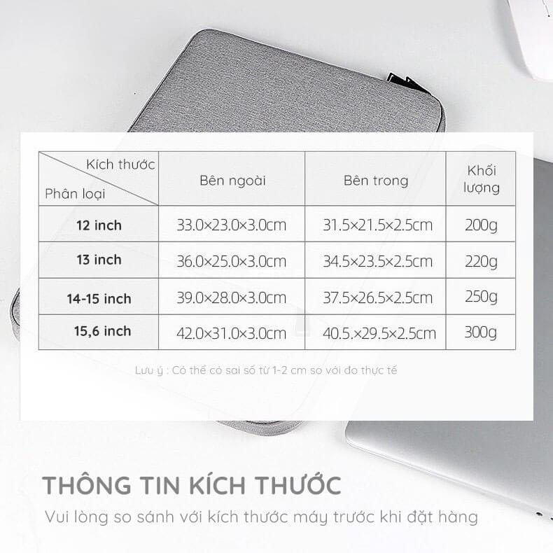 Kích thước từng size của laptop, lưu ý chọn size theo chiều dài và chiều rộng của laptop